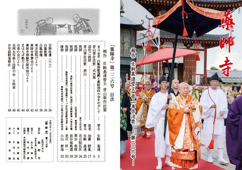 機関誌『薬師寺』は、薬師寺での行事や宗教活動をお知らせするとともに、仏教に対する理解を深めて頂くために発行しているものです。
